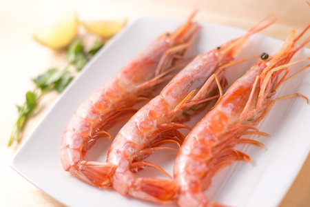 Fresh shrimp with lemon slice prepared for cooking or serving at a seafood meal