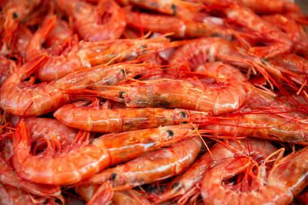 large boiled red prawns sold on outdoor italian market in Sicily