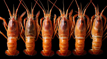 Six vibrant lobsters are arranged neatly, showcasing their distinctive features and textures