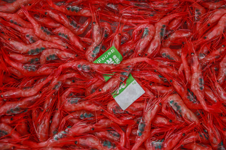 Stock photo of a close-up of a pile of red prawns on an ice base at a market stall