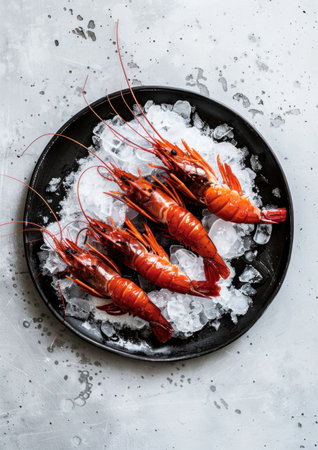 Fresh red shrimp on ice in a black plate, artfully arranged against a light textured background
