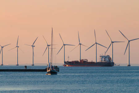 Wind turbines generator farm for renewable sustainable and alternative energy production along coast baltic sea near Denmark. Eco power, ecology.