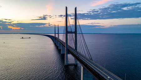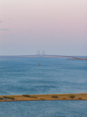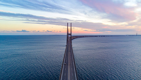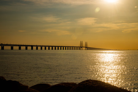 Oresund Bridge on sunset, between Sweden and Denmark, Malmo