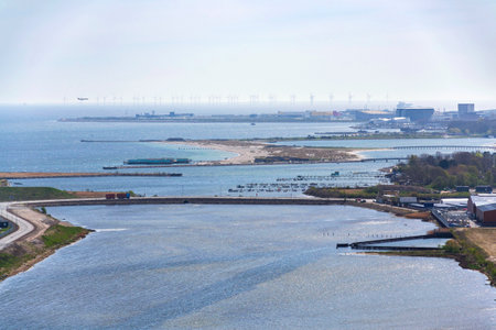Copenhagen seacoast city skyline with Amager beach park, airport and wind farm in background, sunny spring day, Denmark