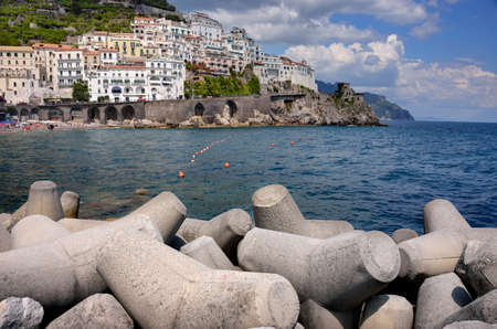 Breakwater of concrete tetrapods helps protect an Italian Amalfi coastal town from the Mediterranean Sea.