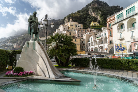Amalfi, Campania, Italy, February 2020: View of Beautiful Amalfi, Fountain with Statue of Flavio Gioia.
