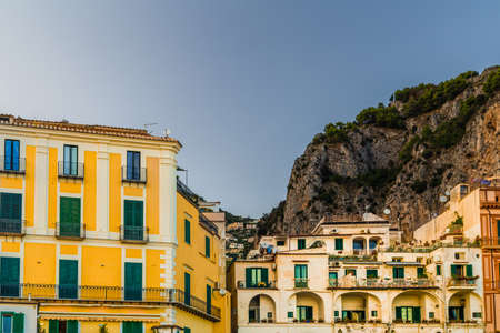 AMALFI, ITALY NOVEMBER 7 2019: Beautiful amazing evening Amalfi city view on the center of the city, houses and sea shore on natural background. Text copy space.