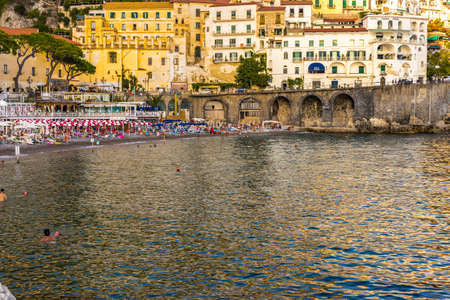 AMALFI (SA). ITALY - AUGUST 30, 2018: tourists are enjoying sunbathing and swimming in Amalfi