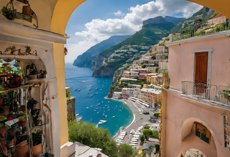Citiscape and landscape of Positano town at Amalfi Coast and Tyrrhenian Sea in Italy in summer. View of beautiful Mediterranean architecture near Sorrento. Europe travel and tourism.