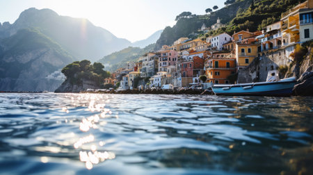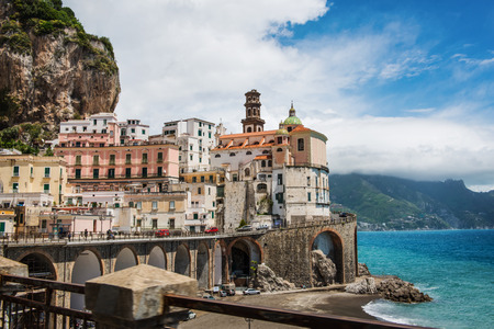 Picturesque village of Atrani, Amalfi Coast, Italy above the gulf of Salerno with its historic houses and old walkway to protect the boats