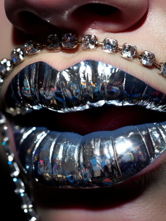 Lips covered with silver lipstick and decorated with rhinestone crystals. AI