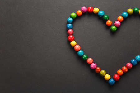 Colorful wooden beads in the form of heart isolated on black background for design. Saint Valentine's Day card on fabruary 14, holiday concept. Copy space for advertisement
