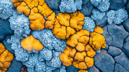 Bright yellow lichen grows in intricate patterns across a textured, rocky surface. The contrast in colors and textures creates a visually striking abstract composition.