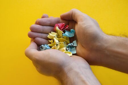 The male hand wrinkled all his notes on the stickers. Scattered on a yellow background