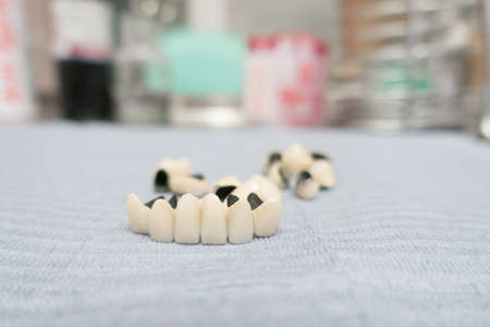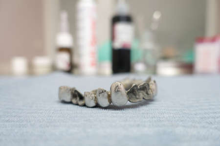 Creating temporary crowns on the implants. The technician holds temporary crowns taken from the plaster model with analogues of implants.