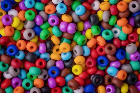 Multi colored beads texture background. Colorful round small beads, full frame shot