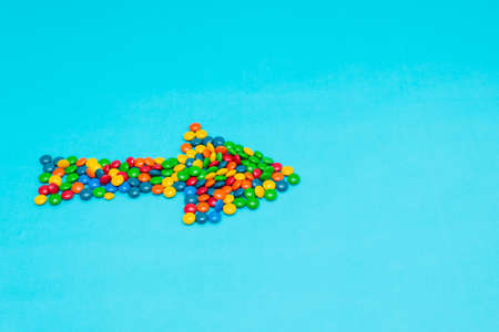 Arrow made with chocolate lunettes on a blue background. Colorful chocolate moons in the shape of an arrow.