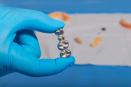 Studio lighting. man in blue gloves holds an implant crown for teeth. Close-up
