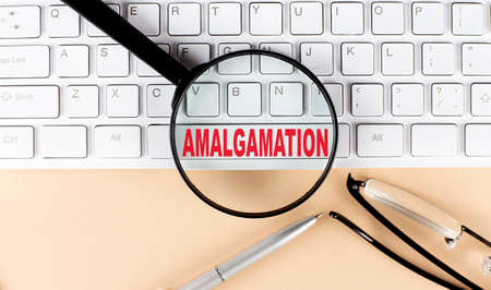 Text AMALGAMATION on keyboard with magnifier , glasses and pen on a beige background