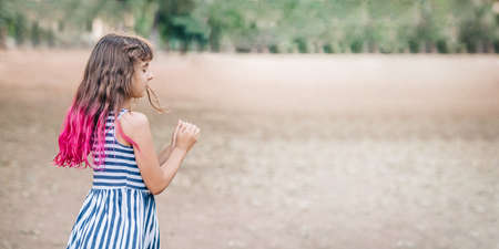 Cute schoolgirl with trendy color hair half dyed pink. Unicorn style girl banner. Child girl in park.