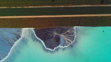 Top down aerial view over natural texture - abstract industrial lake water patterns. Turquoise waternature poluttion