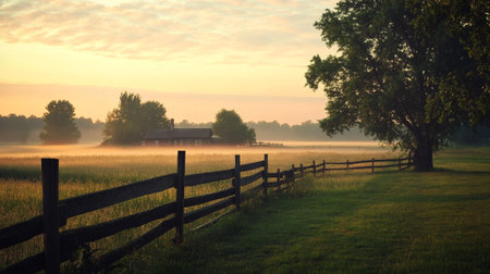 Sunrise in the meadow with wooden fence and old farm house