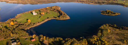A peninsula on the lake. The building of the old church on the peninsula. picturesque landscape. top view.