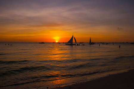 Dramatic orange sea sunset with sailboats in tropical country, clouds. Wide angle. silhouettes of boats, the solar disk. Philippines, Boracay