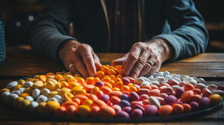 AI Generated. Colorful candy sweets arranged on a pastel pink surface