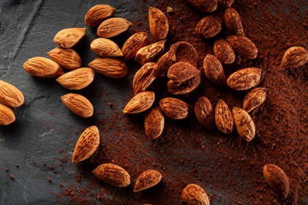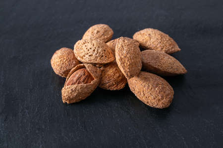Almonds scattered on a black table. Almond is a healthy vegetarian protein nutritious food. Natural nuts snacks.