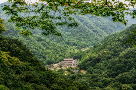 Looking down at a temple in Korea from top of a mountain Taken in Baegyagnsa, South Korea