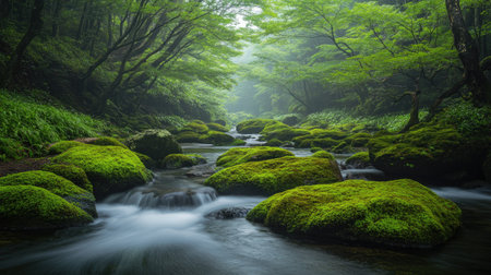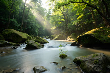 Tranquil view of a shallow, flowing stream bordered by tall, vibrant green bamboo stalks and lush foliage, highlighted by atmospheric morning sunlight filtering through the canopy.