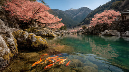 A picturesque scene of koi swimming in a tranquil pond surrounded by blooming cherry blossom trees with majestic mountains in the background, evoking peace.