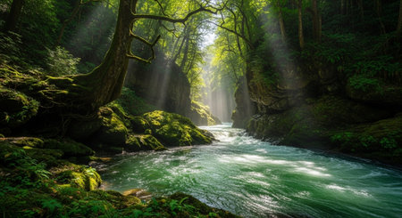 A river carves a path through a rocky gorge, flanked by dense green trees under a cloudy sky. The water reflects the surrounding environment, creating a vibrant visual contrast with the rocks. This landscape image could be suitable for various commercial or editorial applications.