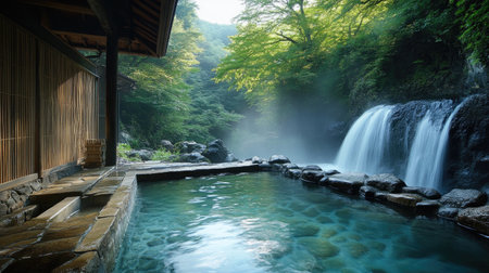 Experience the peaceful ambiance of an outdoor onsen surrounded by lush greenery and a cascading waterfall, perfect for relaxation and rejuvenation.