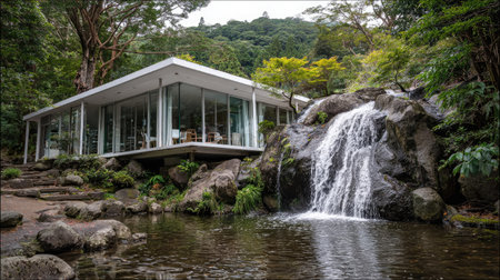 A contemporary glass house with a flat roof sits beside a waterfall cascading into a pond. The scene features abundant greenery with trees and rocks. The composition is balanced and well-lit. This image could be used for architectural design, travel, or environmental themes.