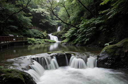 A stunning waterfall cascades through vibrant green foliage in a peaceful forest setting, reflecting nature's beauty and tranquility in a serene landscape.