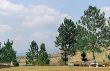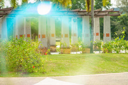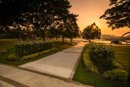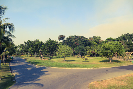 Lawn and trees In the area of the park in the evening. Sunlight in the evening.