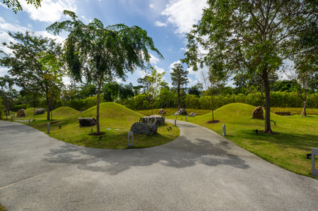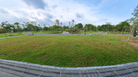 Singapore Chinese Garden A scenic park with young trees, landscaped greenery, winding pathways, and a cloudy sky creating a calm and natural atmosphere