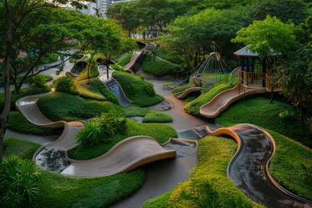 This photo showcases a park with a slide and a play area, providing recreational opportunities for children, A playground overcome with nature and greenery, AI Generated