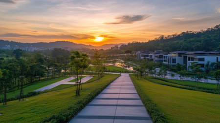 Experience a tranquil sunset view over the serene landscape of UiTM Park, surrounded by lush greenery and a peaceful water reflection, perfect for relaxation.