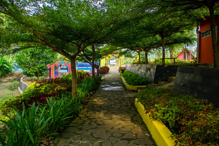 Bogor, Indonesia - A view of the flower themed park Taman Bunga Nusantara in a cloudy afternoon with a view to a water fountain in the middle of a flower field.