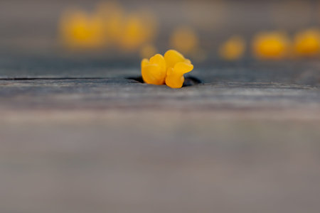 Very small fungus yellow fairy cups or lemon discos, Bisporella citrina, on old wet wood macro texture, selective focus.
