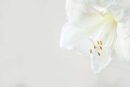 Beautiful white Amaryllis flower, large flowering Moonlight, or Luna isolated on white background. Copy space. Beautiful white macro flower. Soft dreamy image. White flower background.