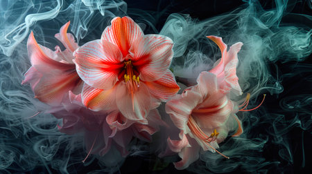 A bouquet of amaryllis flowers in white smoke on a black background. Close-up of three white-pink-red flowers. Women's Day is March 8th. The flowers are surrounded by smoke, which gives the image a mysterious and airy feel