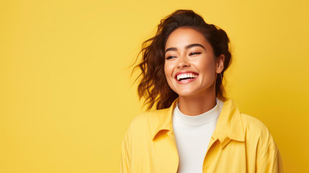 Portrait of a cheerful curvy hispanic woman laughing on a yellow background