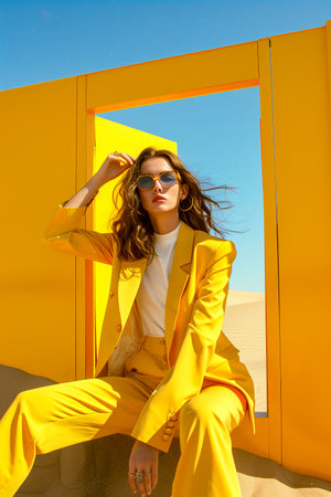 A woman in a yellow suit is sitting in front of a yellow wall. The yellow color of the wall and the suit creates a bright and cheerful mood