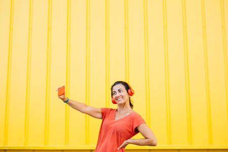 Middle aged woman wearing red headphones and red clothes taking a selfie with a red smartphone against a yellow background