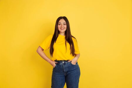 Smiling, posing. Caucasian womans portrait isolated on yellow studio background. Beautiful female brunette model in casual style. Concept of human emotions, facial expression, sales, ad, copyspace.