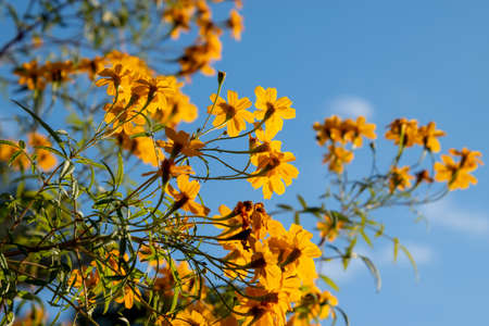 Closeup of nature yellow and orange flower on blue sky background under sunlight with bokeh and copy space using as background natural plants landscape, ecology wallpaper page concept.